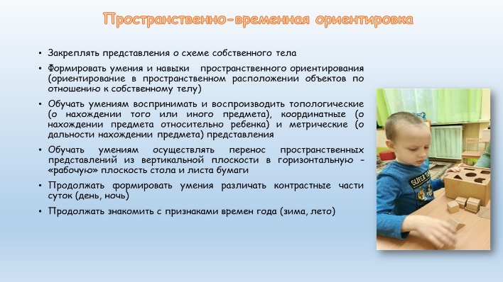 Пространственно-временные представления лежат в основе формирования высших психических функций человека. Основные задачи коррекционных занятий по данному направлению представлены на слайде. У воспитанников с расстройством аутистического спектра затруднено восприятие перевернутых изображений, возникают трудности при пространственном анализе и синтезе ситуации, трудности в выполнении практико-ориентированных действий при определении длины и высоты предъявляемых объектов. Поэтому на индивидуальных коррекционных занятиях мы формируем умения и навыки пространственного ориентирования, обучаемся осуществлять перенос пространственных представлений из вертикальной плоскости в горизонтальную, знакомимся с признаками времен года и др.