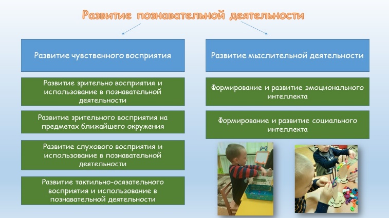 Целью коррекционных занятий «Развитие познавательной деятельности»: является развитие познавательной деятельности воспитанников на основе активизации сенсорных систем, использования эмоциональных стимулов, освоения и обогащения социального опыта. В процессе занятий воспитанники учатся выполнять действия одной, двумя руками (перенесение одному ведерка с водой, вдвоем — корзинки, пакета с продуктами), выполнять поручения по выделению отдельных предметов из общего фона и выполнению просьб: «Возьми чашку», «Дай пирамидку»; различать свойства предметов: большой — маленький, сладкий — кислый, горячий — холодный; мокрый — сухой; выражать эмоции радости, горя, испуга; воспроизводить звуки на определенных музыкальных инструментах (выбор из трех: барабан, детское пианино, металлофон); выполнять задания по речевой инструкции, включающей пространственные отношения между предметами: поставь внизу, наверху, на, под («Поставь матрешку под стол»); понимать и воспроизводить, что чувствует другой ребенок, когда у него отняли игрушку, когда его угостили конфетой и др.