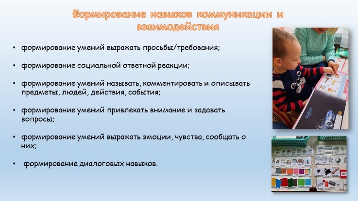 ходе занятий по формированию навыков коммуникации и взаимодействия формируются умения выражать просьбы/требования; называть, комментировать и описывать предметы, людей, действия, события; умения привлекать внимание и задавать вопросы; выражать эмоции, чувства, сообщать о них и др. На начальном этапе нашей работы основной из задач на занятиях такого типа было введение альтернативной коммуникации, сейчас это стимулирование речевых высказываний воспитанников с расстройством аутистического спектра.