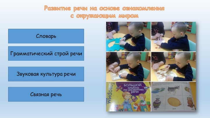 Целью коррекционных занятий по развитию речи на основе ознакомления с окружающим миром является формирование у воспитанников с расстройством аутистического спектра разных структурных уровней системы языка – фонетического, лексического, грамматического, навыков владения языком в его коммуникативной функции на основе ознакомления с окружающим миром. Материал распределен по лексическим темам и включает направления коррекционной работы: словарь, грамматический строй речи, звуковая культура речи, связная речь.