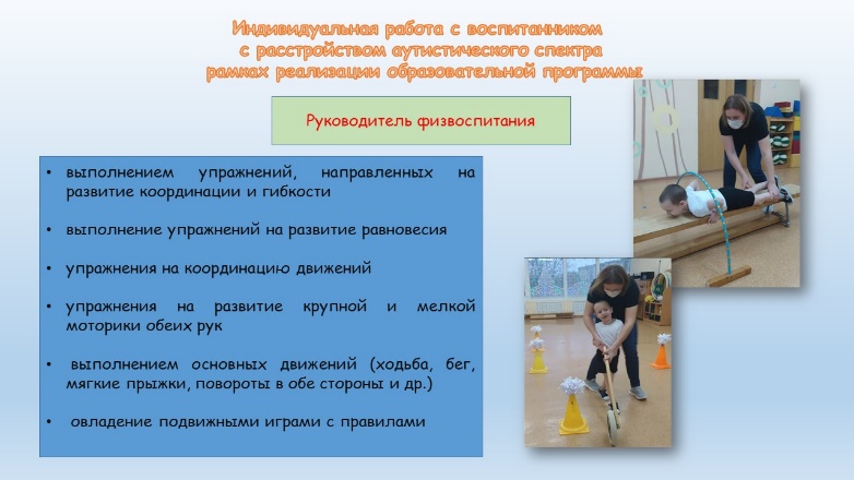 Помимо основных занятий по образовательной области «Физическая культура» руководителем физвоспитания осуществляется еженедельная индивидуальная работа с воспитанниками. Результаты наблюдений за ребенком с расстройством аутистического спектра на занятиях и в свободной деятельности позволили определить основные направления индивидуальной работы: выполнение основных движений, направленных на развитие равновесия, гибкости, координации рук, развитие мелкой и крупной моторики и др. В ходе индивидуальной работы осуществляется активизация глагольного словаря ребенка.