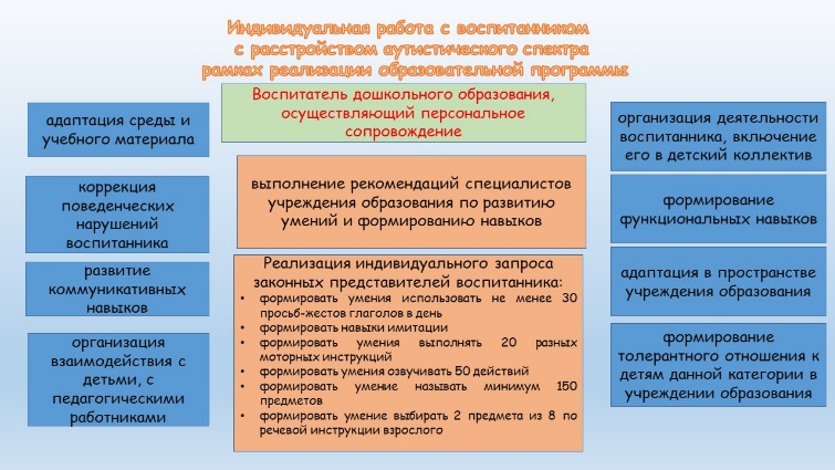 Воспитатель дошкольного образования при организации персонального сопровождения ребенка с аутистическими нарушениями осуществляет коррекцию поведенческих нарушений воспитанника, развитие его коммуникативных навыков, организацию взаимодействия с детьми, с педагогическими работниками, адаптацию среды и учебного материала, организацию деятельности воспитанника, помощь в выполнении санитарно-бытовых умений, адаптацию в пространстве учреждения образования, включение в детский коллектив, формирование толерантного отношения к детям данной категории в учреждении образования.