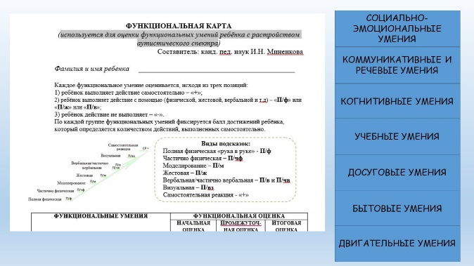 Воспитатели, осуществляющие персональное сопровождение детей с расстройством аутистического спектра, 3 раза в год заполняют функциональную карту, которая используется для оценки функциональных умений ребёнка с расстройством аутистического спектра. Результаты оценки функциональных умений определяют направления индивидуальной работы с воспитанниками.
