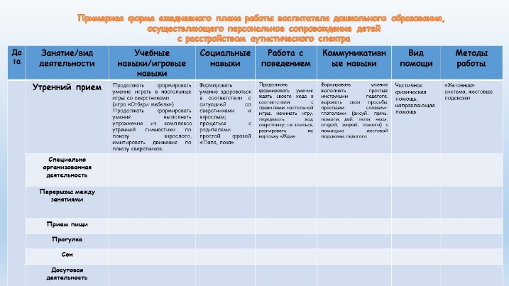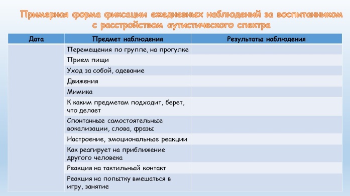 Результаты наблюдений за воспитанником с расстройством аутистического спектра в течение дня фиксируются воспитателем дошкольного образования в специальной таблице.