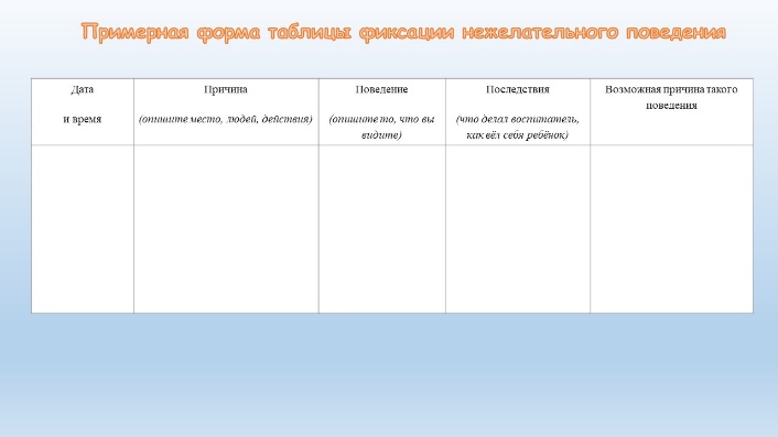 Одним из важных и сложных позиций в работе воспитателя, осуществляющего персональное сопровождение детей с расстройством аутистического спектра, является работа с поведением. Но для того, чтобы с поведением работать, необходимо знать, когда, при каких условиях и почему оно возникло. Для этого факты возникновения нежелательного поведения дополнительно фиксируются в специальной таблице.