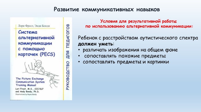 Следует отметить, что эффективность работы по внедрению альтернативной коммуникации напрямую зависит от сформированности у ребенка с расстройством аутистического спектра умения различать изображения на общем фоне, сопоставлять похожие предметы, сопоставлять предметы и картинки.