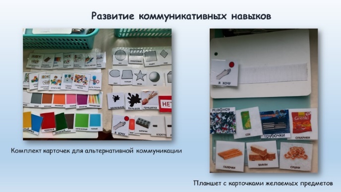 С целью организации работы по формированию навыков коммуникации с воспитанниками с расстройством аутистического спектра была проведена стартовая диагностика коммуникативных навыков, оформлен комплект базовых карточек для альтернативной коммуникации.