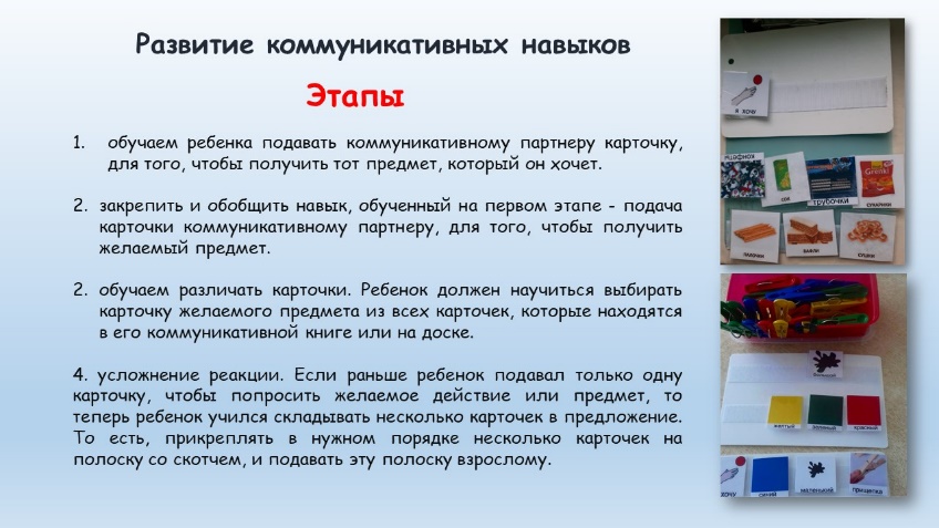 Так как мы параллельно работаем над развитием вокальных навыков, то на данном этапе происходит замена альтернативной коммуникации на простые слова-просьбы. Но с помощью карточек мы продолжаем обучаться просить помощь, отвечать на вопросы «да» и «нет», просить перерыв, реагировать на инструкцию «подожди», использовать дополнительные слова и строить фразы, состоящие из 3-4 символов (слов), реагировать на вопрос «Что ты хочешь?» и др.