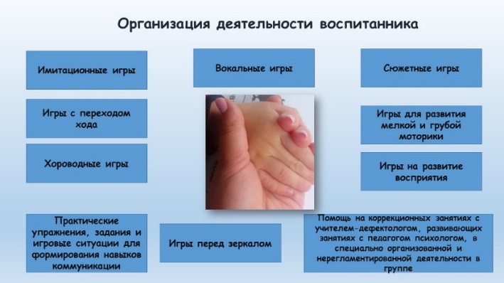 В течение дня и в перерывах между занятиями коррекционной направленности деятельность воспитателя дошкольного образования, осуществляющего индивидуальное сопровождение детей с расстройством аутистического спектра, направлена на проведение имитационные игр, игр с переходом ходов, хороводных игр, игр перед зеркалом, сюжетных игр и др., практических упражнений, заданий и игровых ситуаций для формирования навыков коммуникации. Дополнительно планируются и организовываются игры для развития мелкой и грубой моторики, игры на развитие восприятия, познавательные игры индивидуально и с подгруппой воспитанников. Воспитаннику оказывается помощь на коррекционных занятиях с учителем-дефектологом, развивающих занятиях с педагогом психологом, специально организованной и нерегламентированной