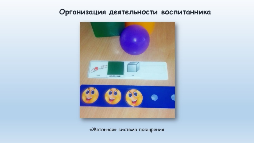 Для обеспечения результативности деятельности воспитанника с расстройством аутистического спектра мы ввели «жетонную» систему поощрения, когда в процессе игры или выполнения задания ребенок получает жетоны, а собрав нужное количество – может обменять их на сладости, совместную игру и др. Для ребенка с расстройством аутистического спектра поощрение – это своего рода вознаграждение за выполненное задание, за правильно сделанное действие. В будущем поощрение будет создавать для ребенка дополнительную мотивацию, которая подталкивает его выполнять задание. На начальном этапе нашей работы поощрение было главной и единственной мотивацией.
