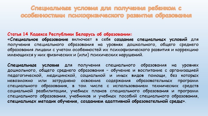 Специальные условия для получения специального образования на уровнях дошкольного, общего среднего образования – обучение и воспитание с организацией педагогической, медицинской, социальной и иных видов помощи, без которых невозможно или затруднено освоение содержания образовательных программ специального образования, в том числе с использованием технических средств социальной реабилитации, учебных планов специального образования и программ специального образования, учебников и учебных пособий специального образования, специальных методик обучения, созданием адаптивной образовательной среды».