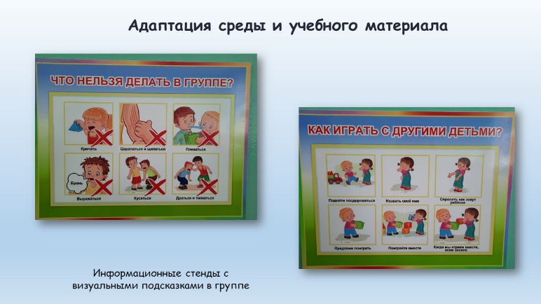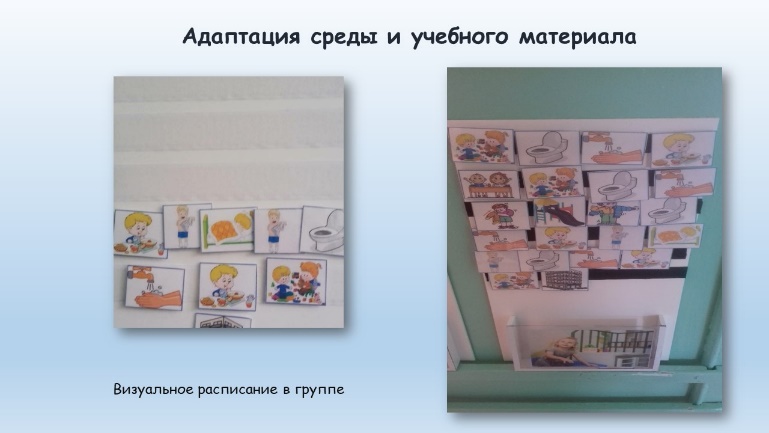 На начальном этапе работы первостепенное значение придавалось построению соответствующей предметной игровой среды в группе. Для воспитанников с расстройством аутистического спектра было разработано и оформлено визуальное расписание. Суть визуального расписания заключается в том, что каждый вид деятельности ребенка в течение дня обозначается картинкой или фотографией с подписью или без неё. Применение визуального расписания позволило решить сразу несколько задач: повысить самостоятельность, обучить обходиться без подсказок и инструкций других людей, позволило значительно уменьшить проявление нежелательного поведения и развить навыки сотрудничества, проработать навыки социального взаимодействия.