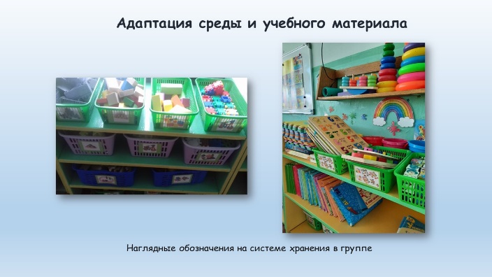 Кроме того, дополнительно произведена систематизация имеющегося игрового материала и атрибутов в группе, для облегчения использования их детьми с расстройством аутистического спектра оформлены наглядные обозначения на системе хранения. Оформление алгоритмизированной предметной среды в группе для детей с расстройствами аутистического спектра применяется по двум основным причинам. Она облегчает коммуникацию взрослых с ребенком и облегчает коммуникацию ребенка со сверстниками.