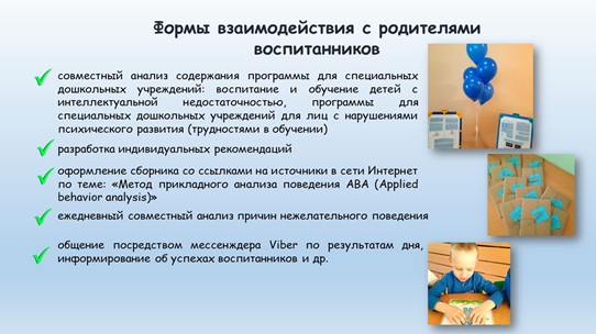 Одним из основных направлений в работе с законными представителями воспитанников с расстройством аутистического спектра была организация психолого-педагогического просвещения по вопросам организации образовательного процесса и коррекционной работы. Результаты проведенного анкетирования позволили определить наиболее эффективные формы взаимодействия: совместный анализ содержания программы для специальных дошкольных учреждений: воспитание и обучение детей с интеллектуальной недостаточностью, программы для специальных дошкольных учреждений для лиц с нарушениями психического развития (трудностями в обучении), разработка индивидуальных рекомендаций, оформление сборника со ссылками на источники в сети Интернет по теме: «Метод прикладного анализа поведения ABA (Applied behavior analysis)», ежедневный совместный анализ причин нежелательного поведения, общение посредством мессенждера Viber по результатам дня, информирование об успехах воспитанников и др. Совместно с учителем-дефектологом и педагогом-психологом ежедневно мы снимаем видеоролики с отрывками занятий, размещаем их для родителей воспитанников с расстройством аутистического спектра в мессенджере Viber лично для каждого родителя, тем самым информируя законных представителей об основных направлениях работы и успехах воспитанников в течение дня.