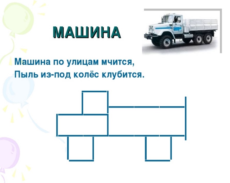 - Игровые: дидактическая игра «Загрузи грузовик», упражнение «Едем по городу», графическое упражнение «Автомобиль».