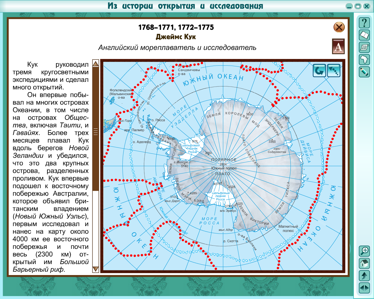 Английский мореплаватель и исследователь, руководил тремя кругосветными экспедициями и сделал много открытий. Этот путешественник первым отправился на поиски южного материка, но открыл Австралию. Второе свое кругосветное путешествие он посвятил поискам еще одного нового материка на юге. Впервые пересек Южный полярный круг и обошел Антарктиду. Доказал, что если и есть южный материк, то только вблизи Южного Полюса, в царстве вечного снега и льда. Однако он заявил: “…беру на себя смелость утверждения, что никто, никогда, не проникнет дальше, чем я, и что земли, которые могут лежать южнее, никогда не будут исследованы”.