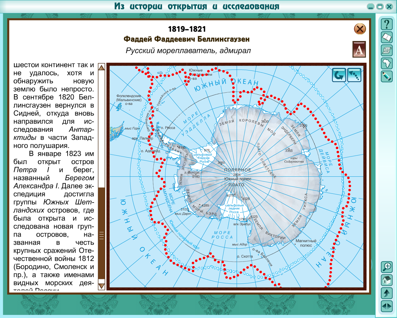 Вторая русская кругосветка на двух небольших судах «Восток» и «Мирный» отправилась в путь в 1819 г. Руководители экспедиции решили двинуться вокруг ледяного поля, окружающего Антарктику. 22 января 1820г. экспедиция вплотную подошла к берегам Антарктиды. Высадиться на берег не удалось, но с той поры именно этот день, 22 января 1820 года, когда люди впервые увидели Антарктиду, считается днем открытия нового материка.