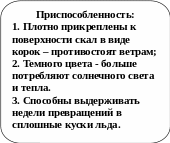 1.Из наземных растений на самом материке встречаются только мхи, лишайники, низшие водоросли, бактерии. Наиболее богато представлены лишайники, которых насчитывается около 300 видов. Их можно встретить на всех свободных ото льда участках суши. Лишайники имеют следующие приспособления: они плотно прикреплены к поверхности скал в виде корок, так, что отскоблить их можно только ножом. Таким образом, они противостоят ветрам. Также они темного цвета, что позволяет им потреблять больше солнечного света и тепла. Мхи и лишайники способны выдерживать недели превращений в сплошные куски льда.