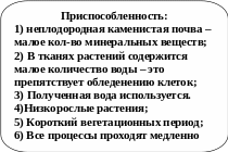 4. Всем растениям приходится довольствоваться неплодородной каменистой почвой, что выработало у них приспособленность к малому количеству минеральных веществ.