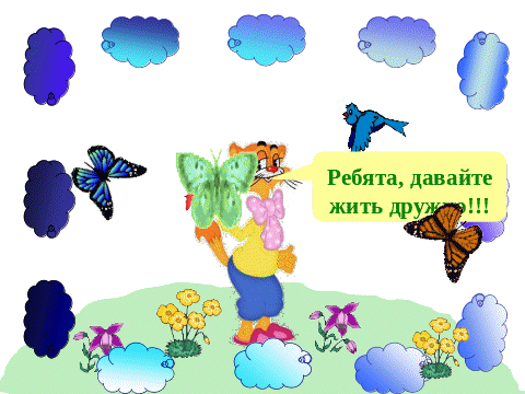 Вы сегодня показали хорошие знания. Все отлично поработали. Я желаю вам добрых и верных товарищей. Давайте скажем друг другу слова известного мультипликационного героя, терпеливого и добрейшего кота Леопольда: «Ребята, давайте жить дружно!»
