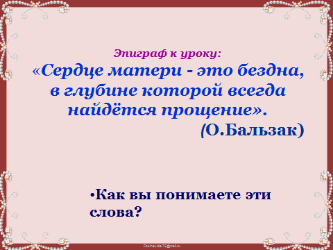 Прочитайте эпиграф к уроку: «Сердце матери - это бездна, в глубине которой всегда найдется прощение». О. Бальзак