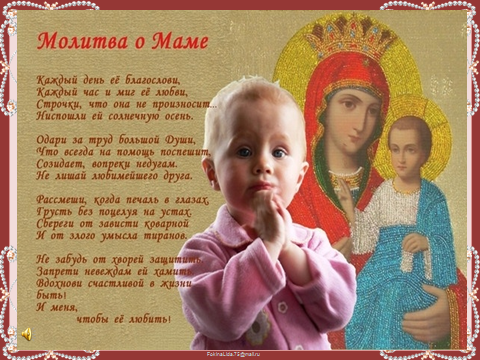 Стихотворение«Молитва о маме»(читает ребёнок). На фоне музыки девочка читает стихотворение. Слайд 8.