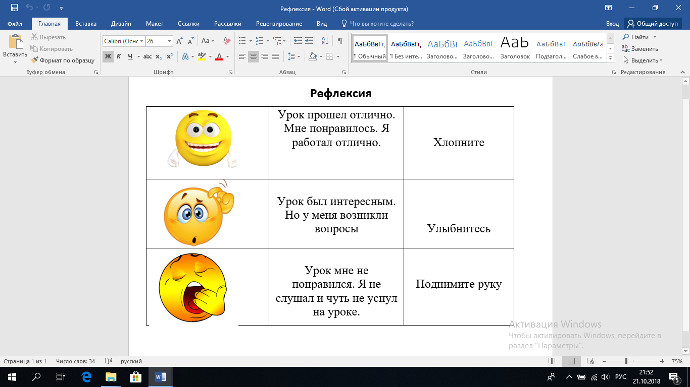 5. | Рефлексия | Учитель предлагает ответить на вопросы: Что было главным на уроке? Какие затруднения у вас возникли при работе на уроке? Что нового вы узнали? Что было интересным? Чему научились? Учитель показывает изображения смайликов, предлагает оценить отношение к уроку.