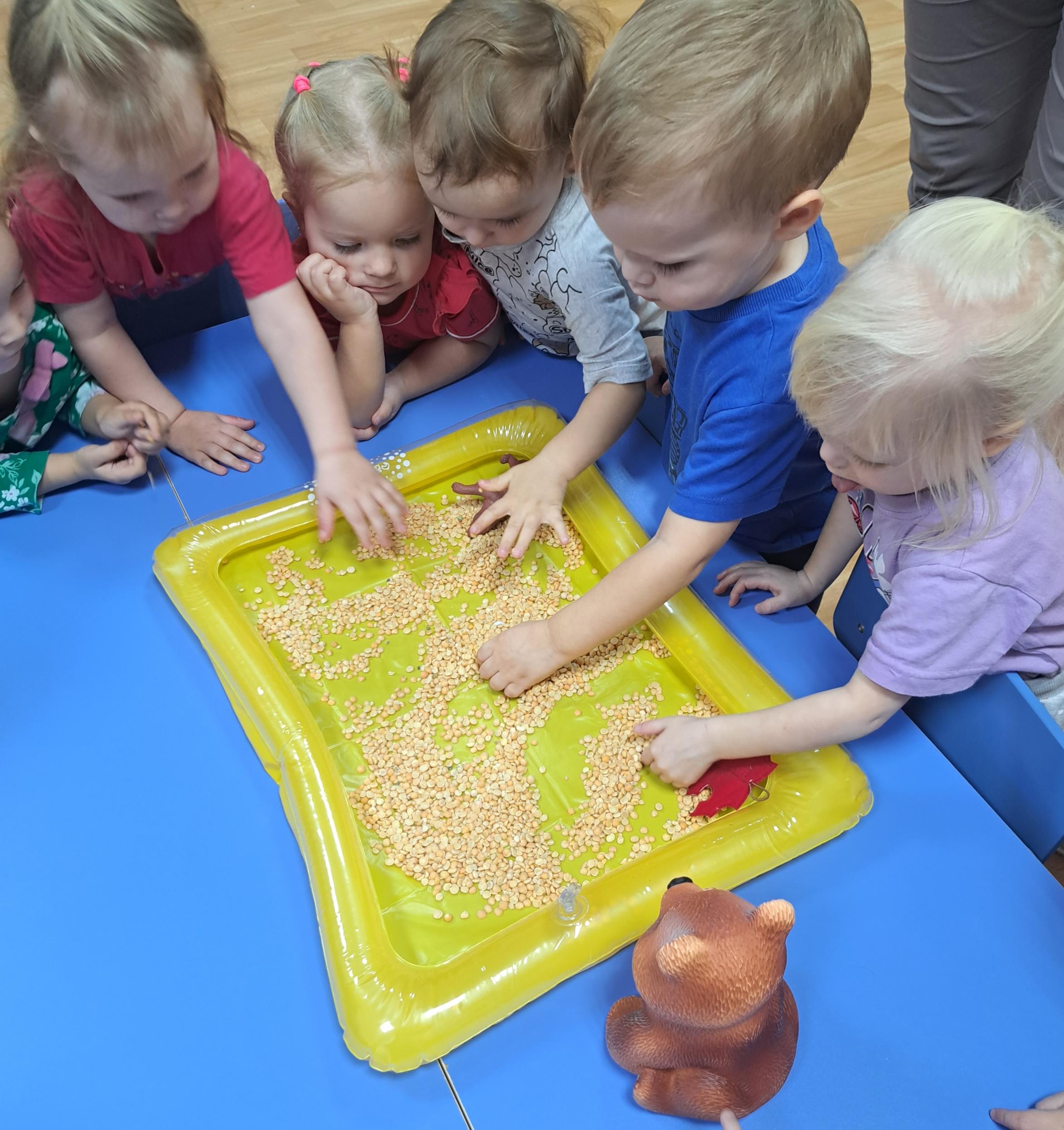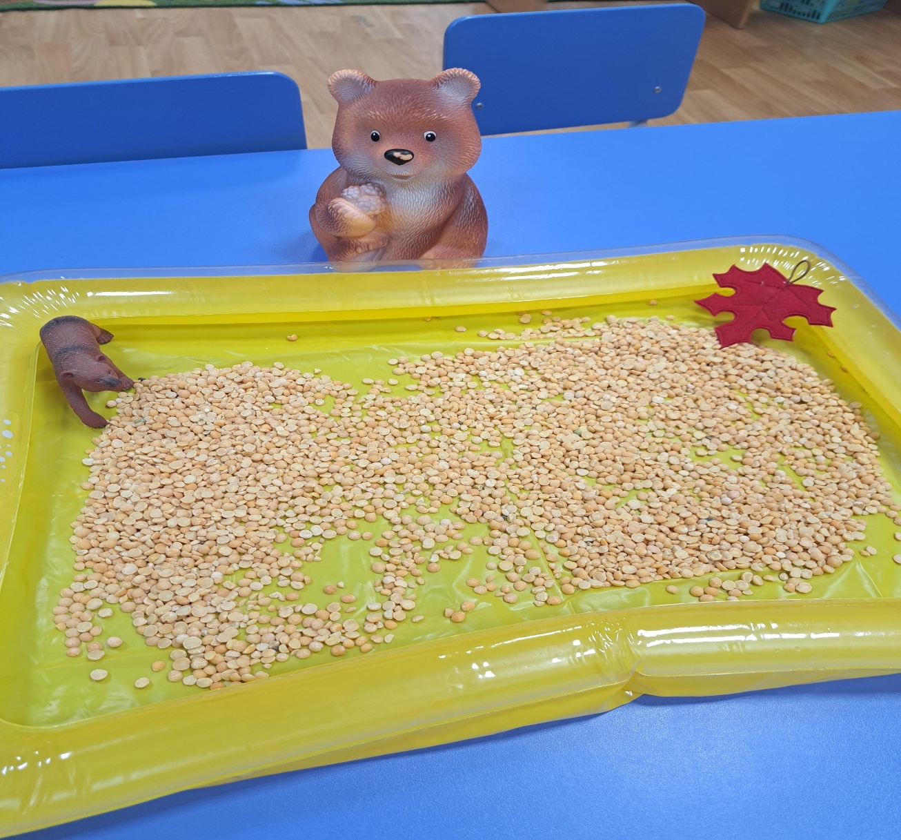 Раздаточный материал: надувная песочница, крупа горох, фигурки медведя различных размеров.