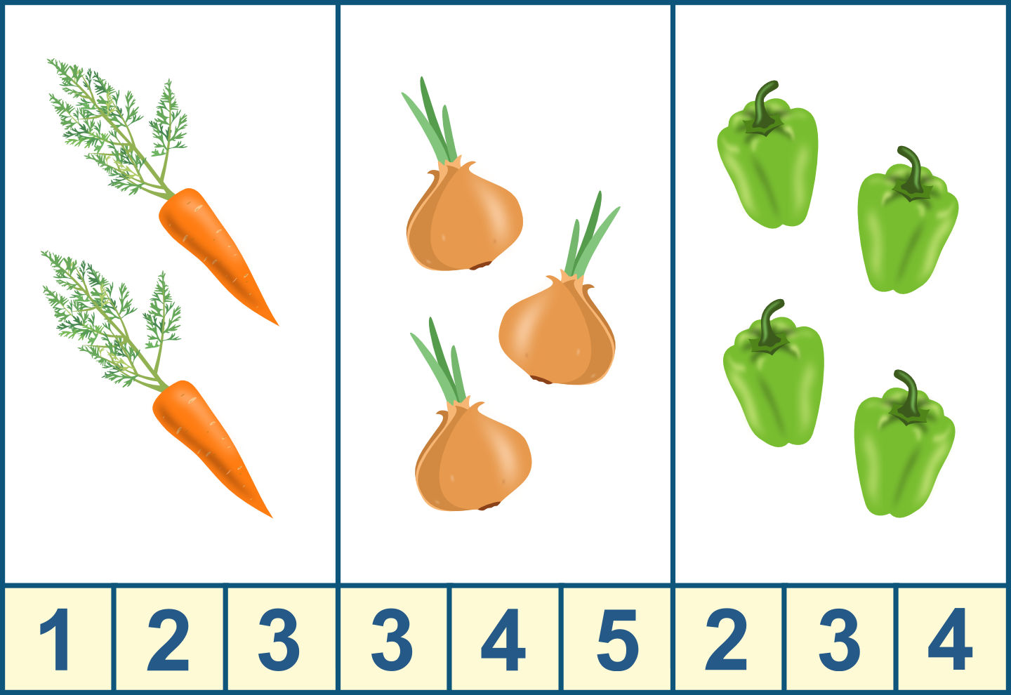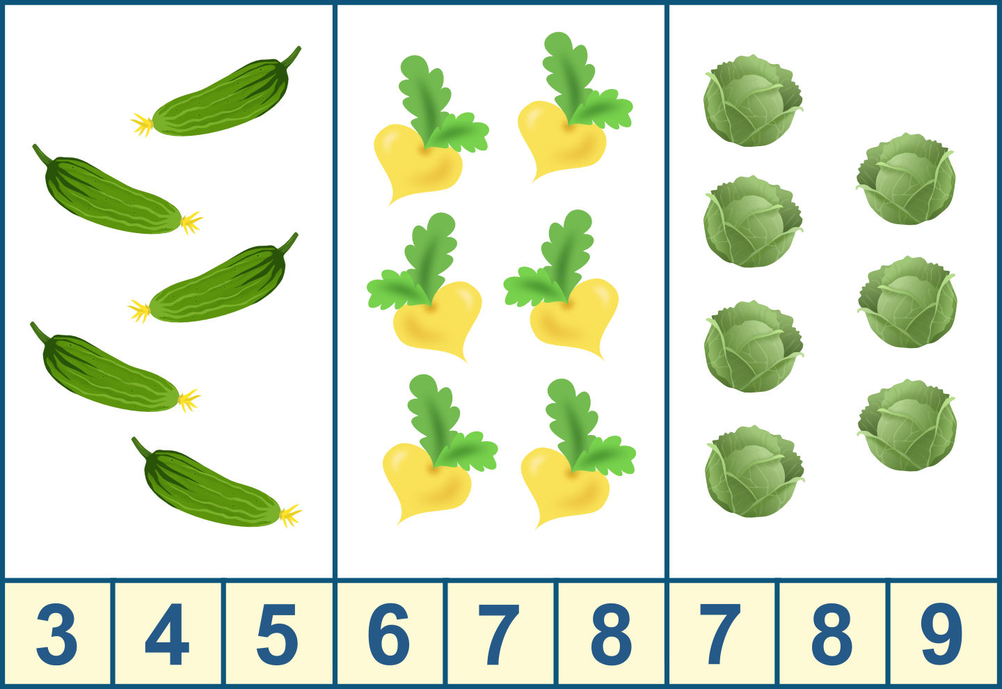 Каждому из детей предлагаются карточки с изображением овощей и цифр. Они должны запомнить, какие были овощи и сколько их по количеству. Затем педагог убирает карточку и просит ребят по очереди назвать, какие овощи они видели; найти их среди предложенных картинок с овощами. Затем возле каждого овоща положить карточку с той цифрой, которая обозначает нужное количество овощей.