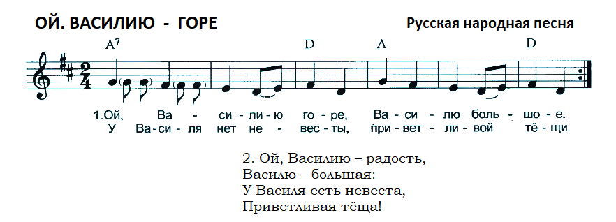 Все поют «ОЙ, ВАСИЛИЮ ГОРЕ» (отводя поочередно то правую, то левую руку):