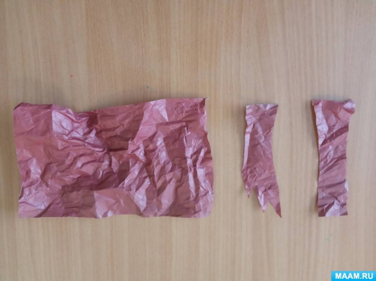 Для изготовления стволов деревьев сминаем лист цветной бумаги и нарезываем длинные прямоугольники.