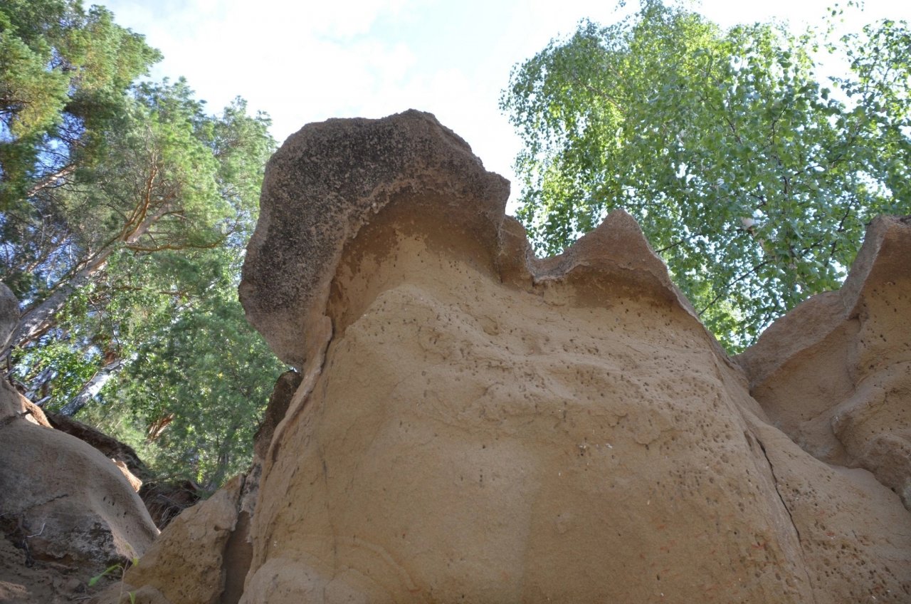 - Вы видите интересное явление: «Тиминские каменные грибы», но меньших размеров. Скорее всего, верхняя часть скальных пород из известняка или доломита, и нижняя часть – из песчаника. Поэтому из-за эрозии песчаник выветривается или вымывается, а известняк остается. Так с помощью стихийных природных сил возникают такие причудливые камни!