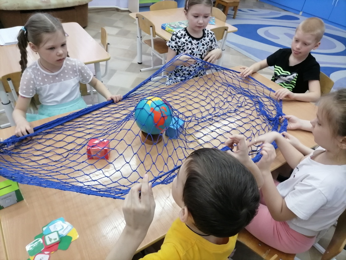 - Каким цветом она обозначена на глобусе? - Вода обозначена синим, голубым, белым цветами. - Наша планета самая красивая из всех планет. Какие ещё планеты вы знаете? - Венера, Марс, Юпитер, Меркурий и др. - На этих планетах нет жизни, потому что нет воздуха и воды.
