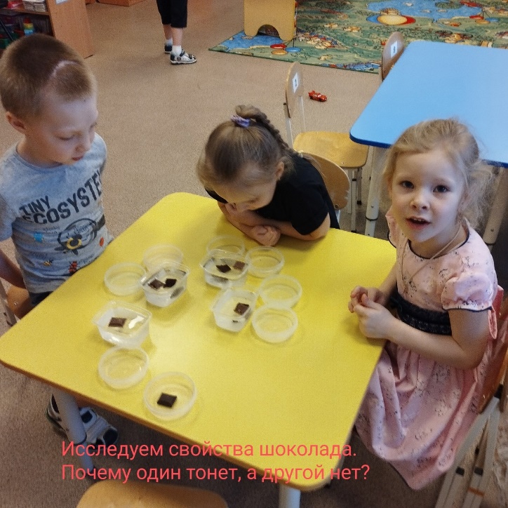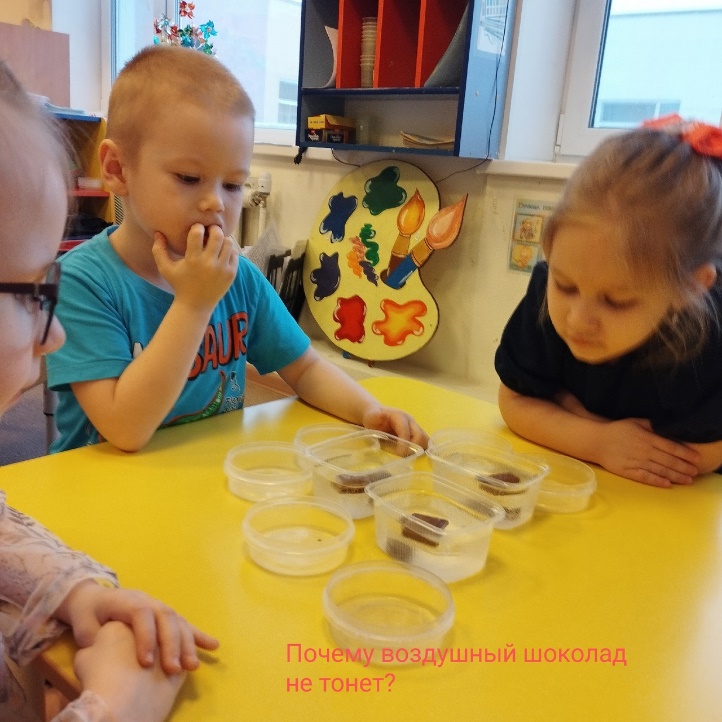 - А теперь положите кусочек от воздушного шоколада. Что произошло с шоколадом? (Шоколад всплыл на поверхность).