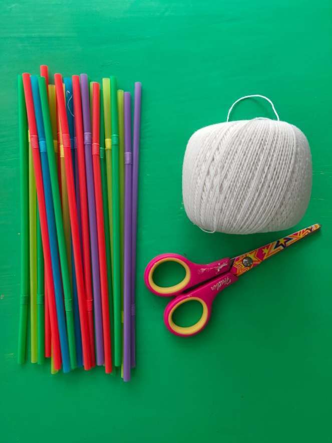Материал: коктейльные трубочки, ножницы, бусины, нитки.