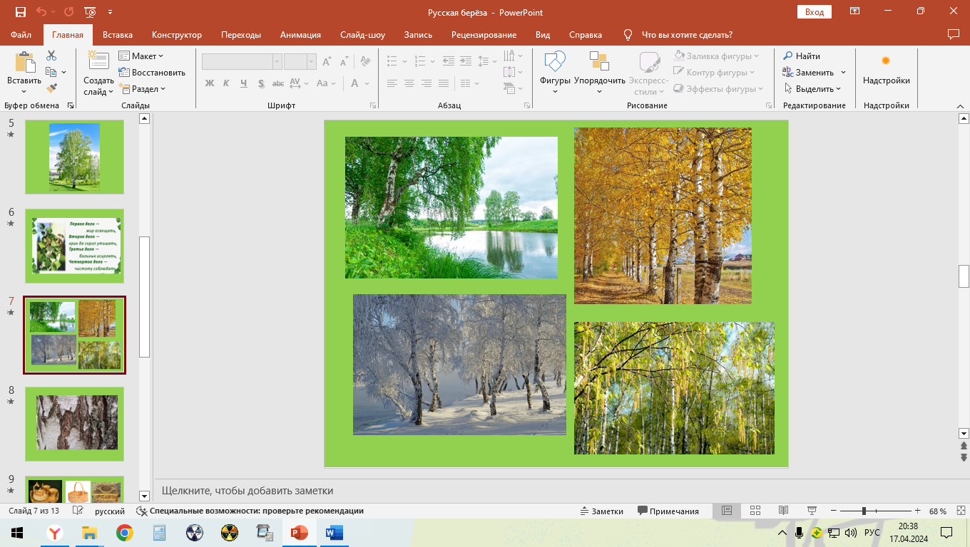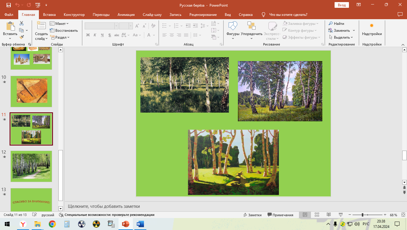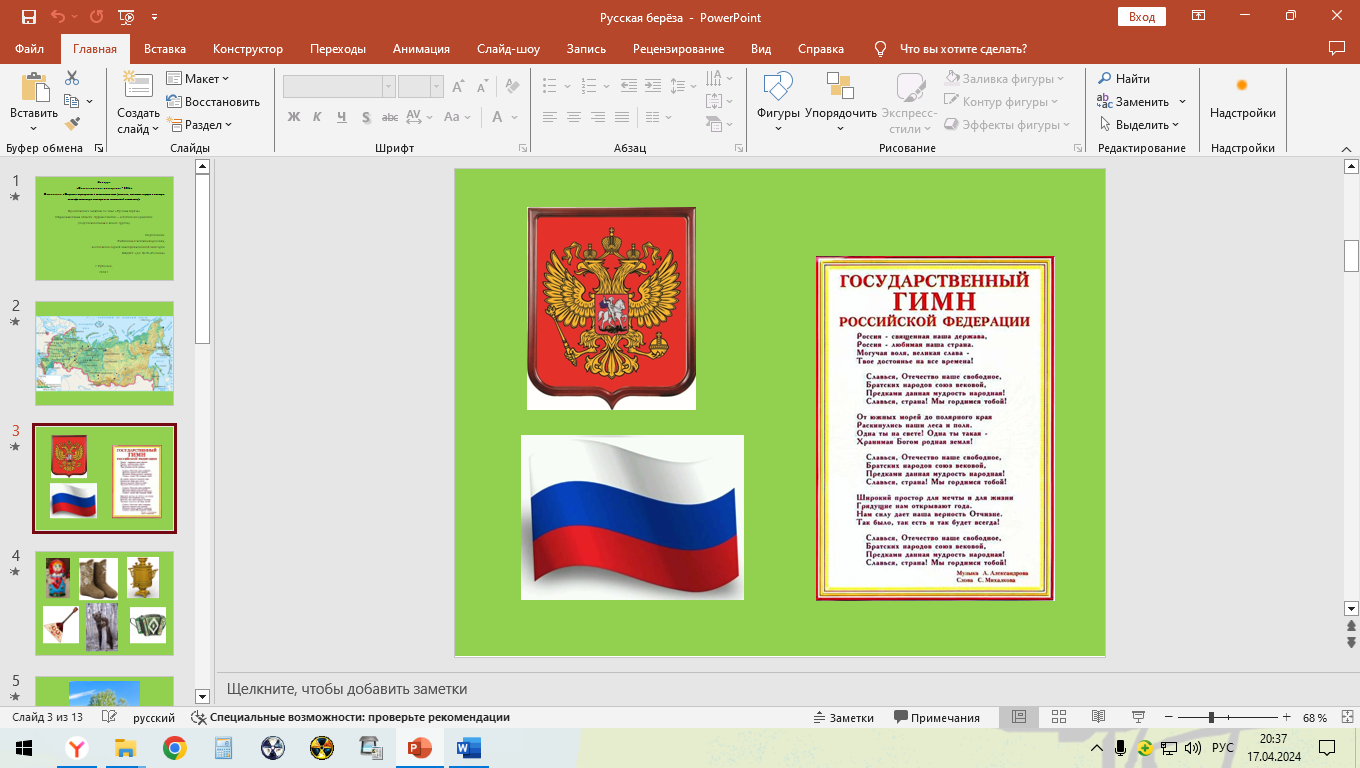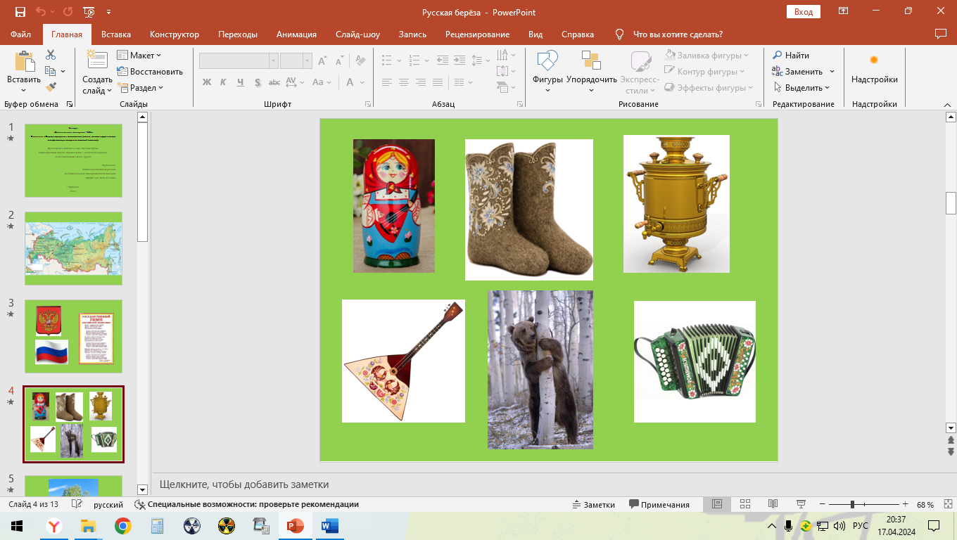 Материал и оборудование: презентация «Русская берёза», телевизор, ноутбук, тонированная бумага для рисования, гуашь белого, черного, зелёного цветов, две кисточки (№3 (белка), № 7 (белка)), баночки с водой, салфетки, фартуки.