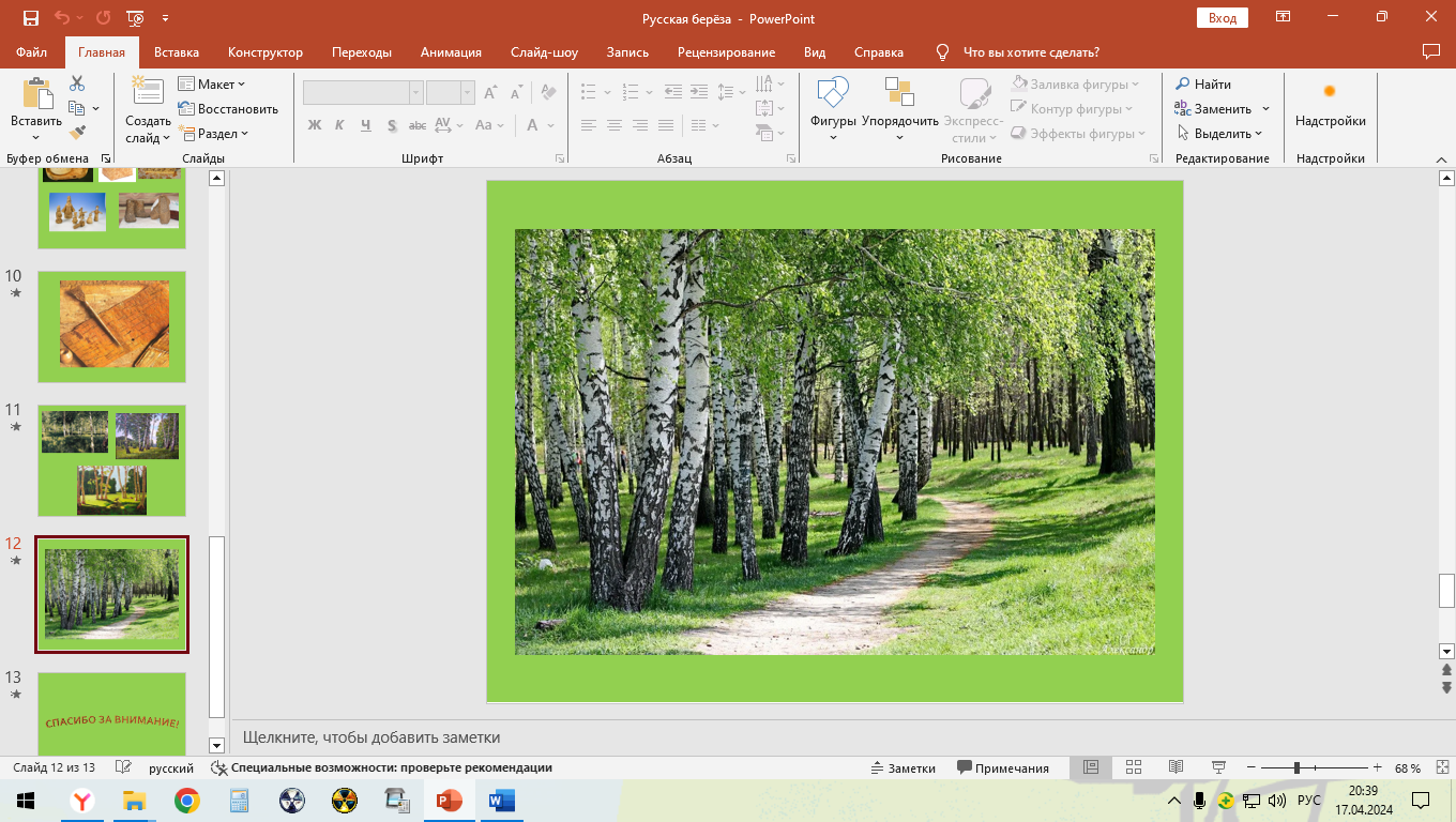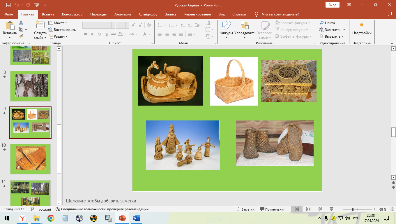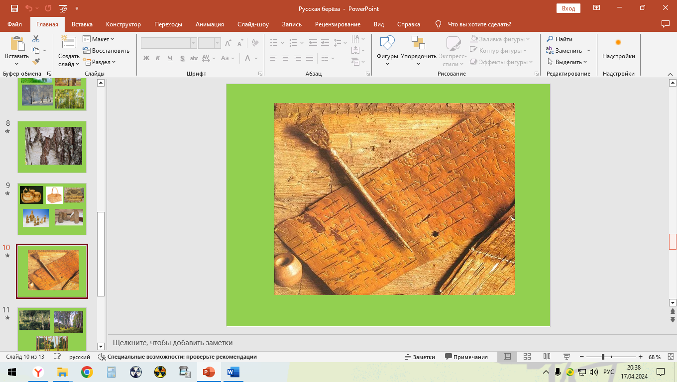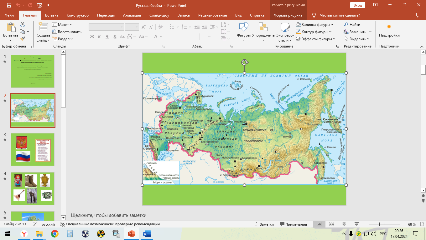 Материал и оборудование: презентация «Русская берёза», телевизор, ноутбук, тонированная бумага для рисования, гуашь белого, черного, зелёного цветов, две кисточки (№3 (белка), № 7 (белка)), баночки с водой, салфетки, фартуки.