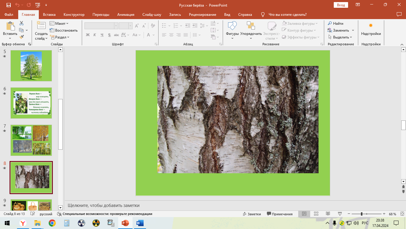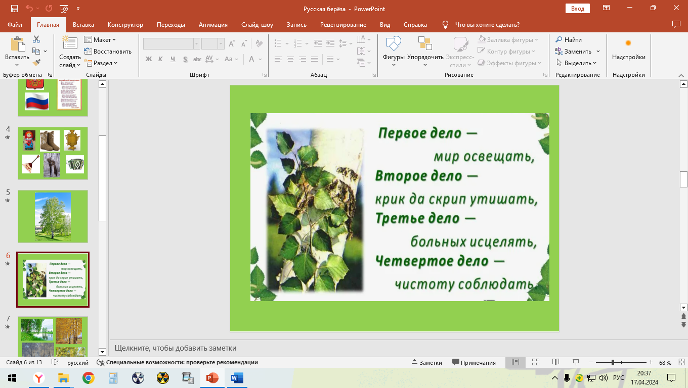 Предварительная работа: наблюдение за берёзой на участке, чтение художественной литературы, разучивание стихов о берёзе: А. Прокофьева, И. Наумова, И. Субботиной, беседа «Русская береза», знакомство с репродукциями художников.