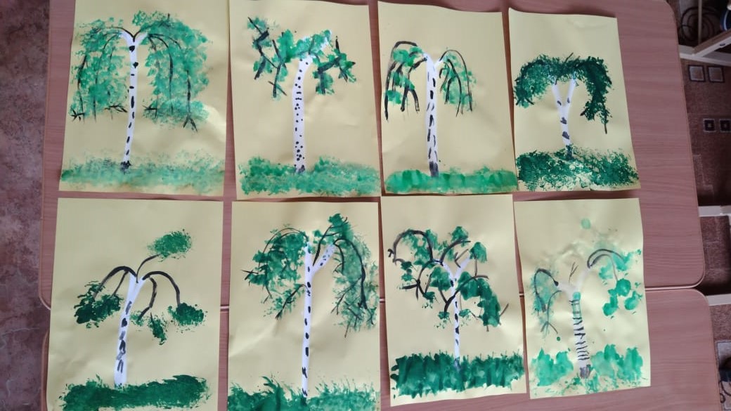 Цель: ознакомление детей с нетрадиционным рисованием – методом тампонирования Задачи: - продолжать расширять представления детей о Родине; - обобщить и систематизировать знания детей о березе- символе России; - воспитывать чувство любви к родной природе. Методы: Наглядный: для стимулирования педагог использует ИКТ (показ слайдов); Словесный: вопросы, ответы, уточнения; Игровой: проведение физминутки; Практический: показ рисования берёзы. | Давайте сегодня познакомимся поближе с еще одним природным символом России. У каждого государства есть свое символическое дерево. - Как вы думаете, какое дерево считается природным символом России? - Вы правы. Ребята, а береза, какая? А вот почему берёза считается природным символом нашей страны, я вам сейчас расскажу. В старину березу называли «деревом четырех дел»: •«Первое дело — мир освещать». На протяжении столетий крестьянские избы освещала берёзовая лучина: она горела долго и почти без копоти и искр. •«Второе дело — крик утешать». В старину берёзовым дёгтем смазывали колёса телег и карет, чтобы они не скрипели. А младенцев «от крика», чтобы ночью они спали спокойно, а днём не капризничали, поили отваром из берёзовых почек. •«Третье дело — больных исцелять». Целебными свойствами обладают практически все части берёзы. По поверью, берёза могла взять на себя любые болезни, отведя их от человека. •«Четвёртое дело — чистоту соблюдать». Берёзовыми вениками и мётлами наводили чистоту и в доме, и во дворе. Береза прекрасна во все времена года. Посмотрите какая красивая береза в разное время. (показываю слайд) Красавицей русских лесов называют люди березу. Это одно из наиболее почитаемых у славян деревьев, символ и гордость русского народа. У березы белый ствол с небольшими черными вкраплениями, они называются «чечевички», через них береза дышит. (Показываю срез березы и брёвнышко). - Давайте повторим, как называются у березы черные вкрапления – чечевички. Раньше березой не просто любовались, но и делали из неё домашнюю утварь (посуду, кузовки, шкатулки, игрушки, обувь, в которой было комфортно и зимой, и летом) а еще верхнюю часть коры – бересту, использовали для письма. - Какую часть коры использовали для письма? - Давайте повторим, для письма использовали берету. Посмотрите на экран (на экране картины русских художников И. Левитан, И. Шишкин, А. Куинджи). Многие великие художники в своих работах изображали красоту белоствольной березки показывали любовь к этому дереву. А как вы думаете почему березу называют белоствольной? А хотели бы, вы, превратится в художников и нарисовать нашу березку? Прежде, чем стать настоящими художниками, я предлагаю сейчас вам немножечко отдохнуть перед нашим перевоплощением. Ребята, а помогите провести мне физминутку. Мы березку посадили, (выпрямиться.) Мы водой ее полили, (руки согнуть к плечам, ладонями вперед.) И березка подросла, (встать на носки.) К солнцу ветки подняла, (Руки вверх.) А потом их наклонила (Руки вниз, спина прямая.) И ребят благодарила. (Поклоны головой.) - Спасибо. Теперь мы готовы рисовать. - Хорошо бродить по березовой роще в любое время года, воздух в ней прозрачен и чист. - Ребята, сейчас мы создадим свою березовую рощу?! - Для этого каждый из вас нарисует берёзу. Давайте вспомним, как рисуется береза. (Сначала мы рисуем ствол, затем ветки и листья.) У березы 