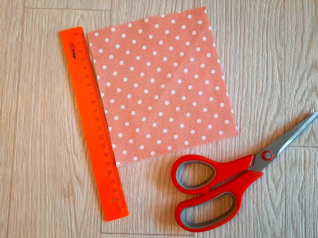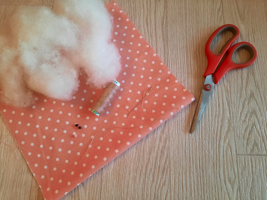 Вырежьте из ткани прямоугольник желаемой для вас величины, от размера прямоугольника зависит величина зайки.