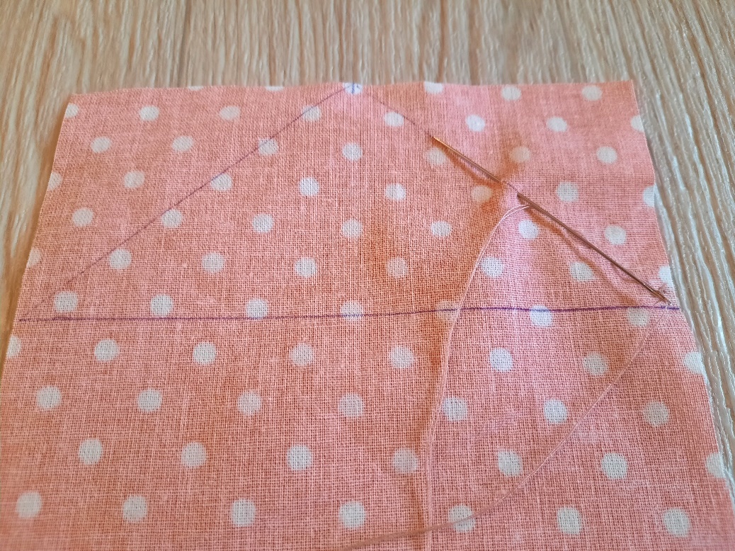 Подберите нить в цвет ткани. Начиная сбоку, прошейте швом «вперёд иголку» по всем сторонам треугольника, шириной шага не более 0,5 см. Нить не закрепляйте!