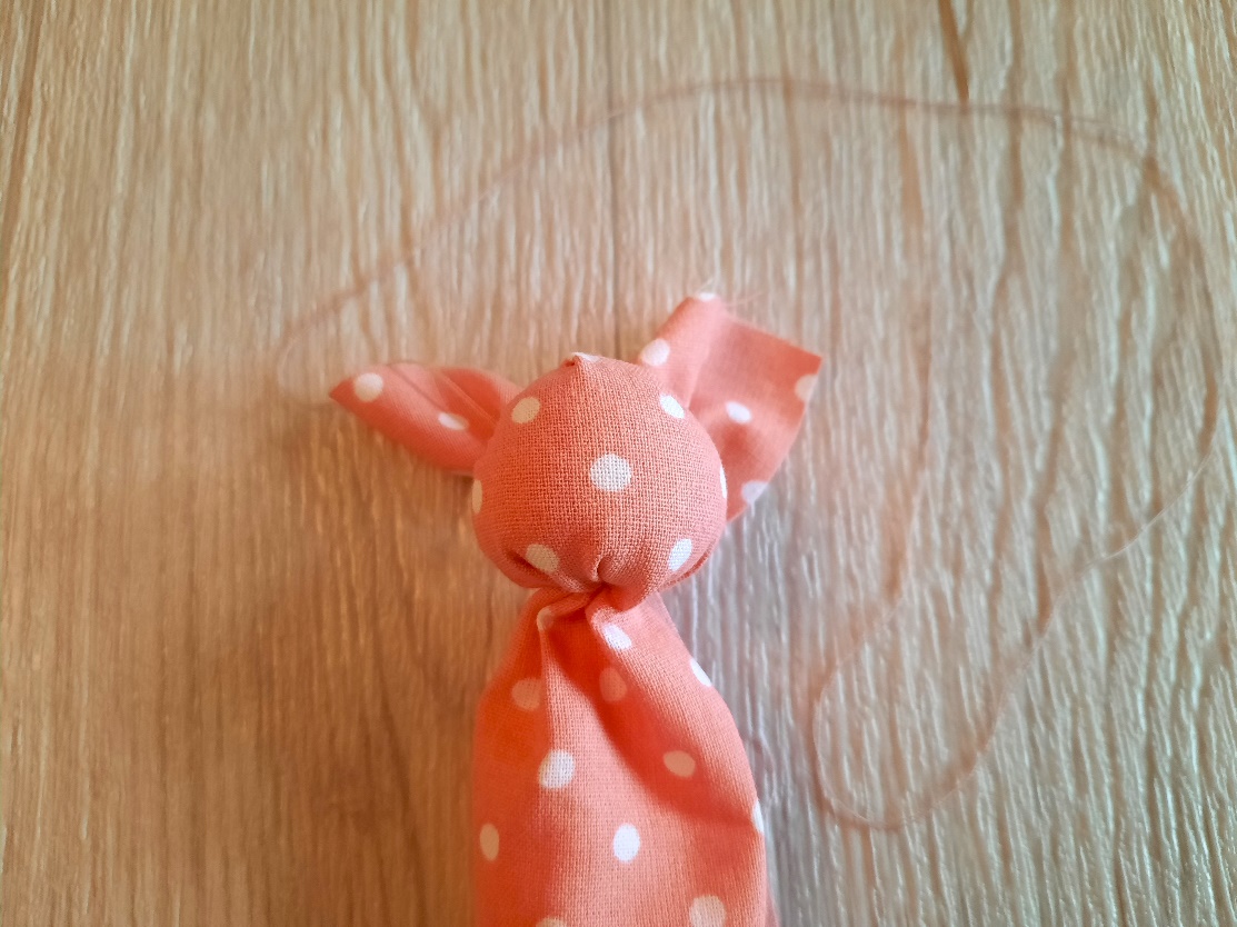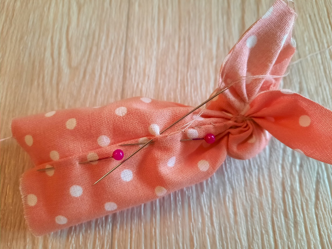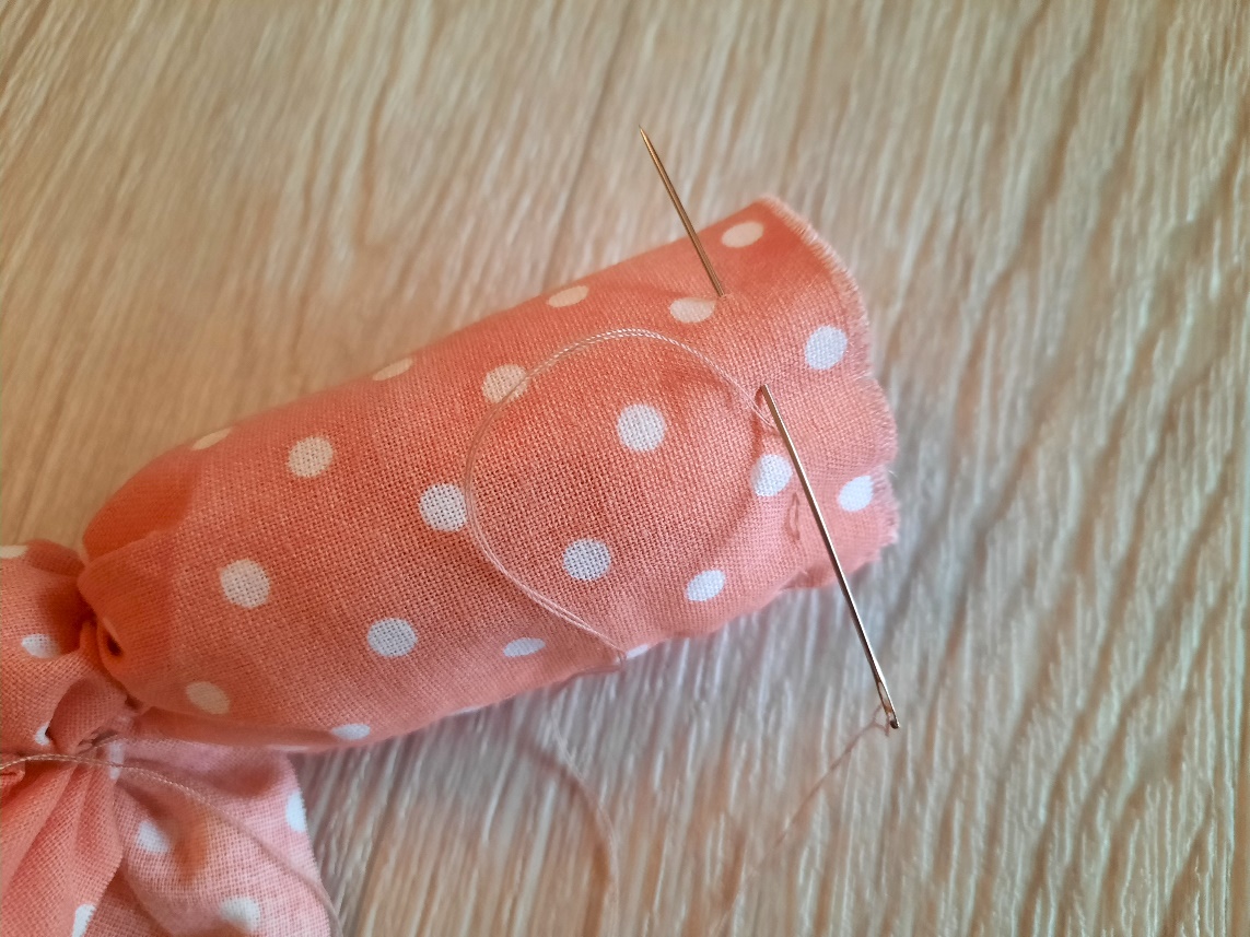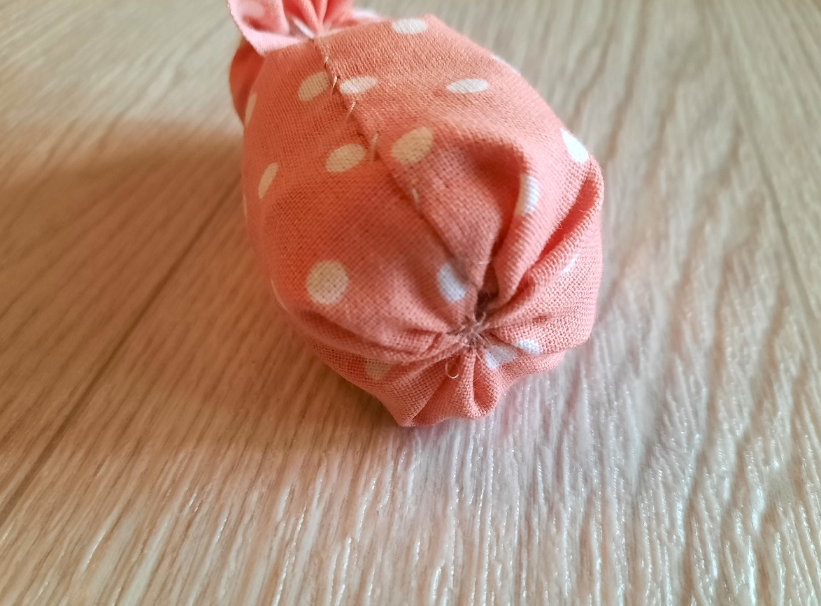 Наполните «мешочек» синтепоном до упругости, затяните нитку до конца и закрепите. Если рабочая нить осталась достаточно длинной, её можно не отрезать и продолжить работать…