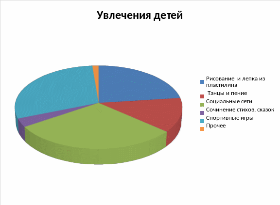 Для проведения анкетирования мною были подобраны вопросы, касающиеся увлечений детей, не более 10 вопросов, чтобы не было утомительно. Далее на втором листе предлагалось выполнить одно из заданий: раскрась понравившийся предмет, либо нарисуй свой. (Приложение 1). Анкетирование проводилось среди учеников 5 – 9 классов. По результатам анкетирования мною была составлена диаграмма. (Диаграмма 1).