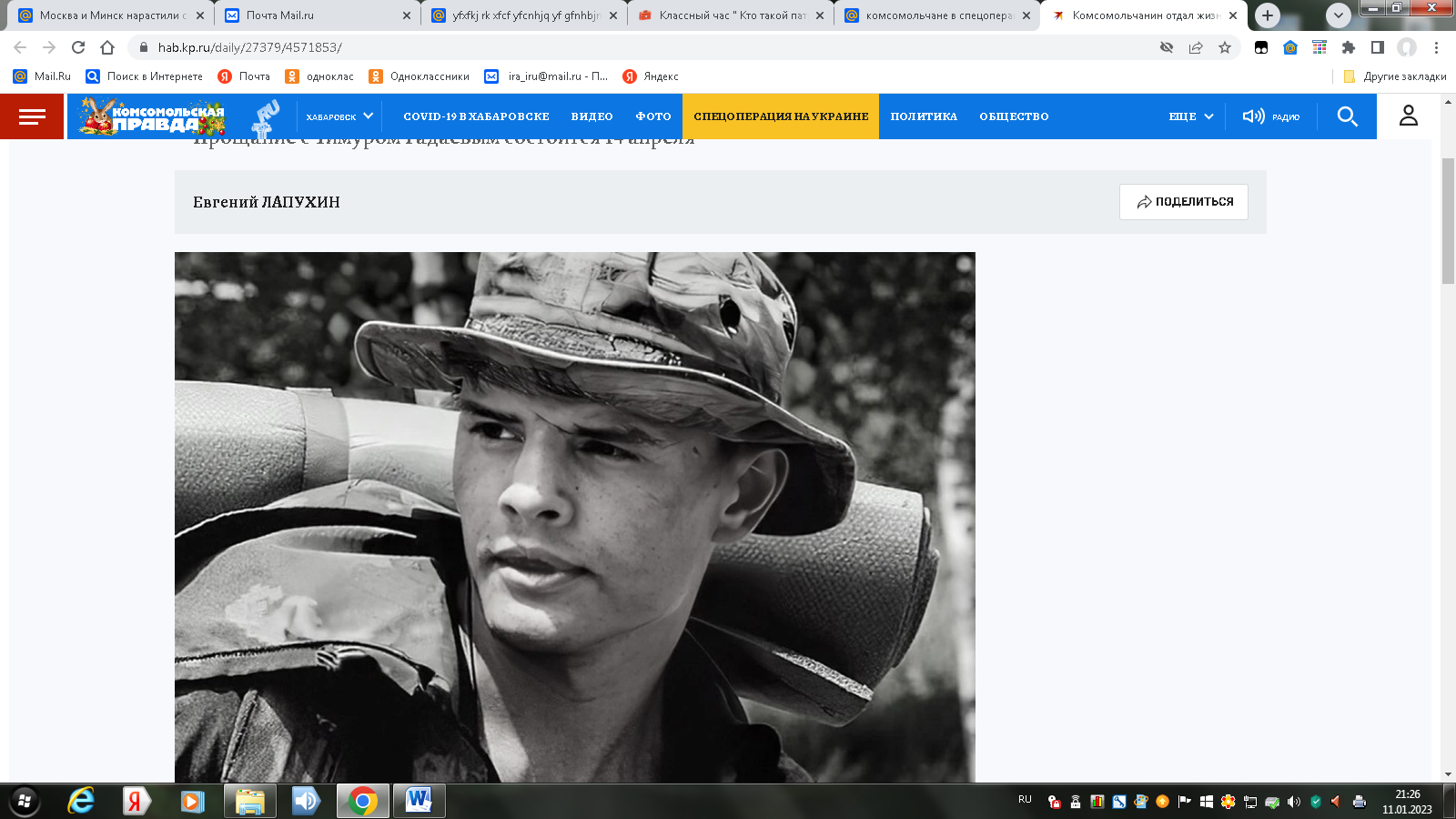 25-летний Тимур Гадаев - наш земляк, комсомольчанин, погиб во время спецоперации на Украине. Как вспоминают знакомые Тимура Гадаева, молодой человек любил спорт, был кандидатом в мастера спорта по боксу. Он был преданным товарищем и всегда приходил на помощь сослуживцам.