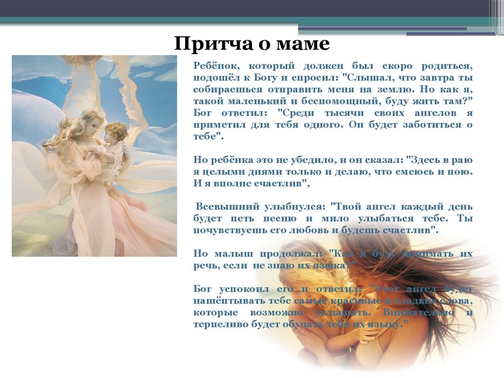 Я очень люблю свою маму! Она очень добрая и заботливая. Утром проснёшься, увидишь мамину улыбку, и на душе становится легко. Рядом с мамой мне тепло и спокойно. Во всех делах она мне помогает, даже если её нет рядом. Вспомнишь, что дома мама ждёт, и всё сразу получается. Мама нужна всем: и людям, и птицам, и зверям.