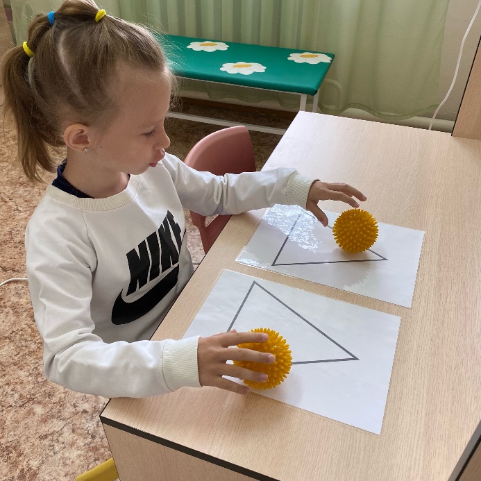 «Прокатывание массажного мячика по геометрическим фигурам» - двумя руками ребенок прокатывает мячики по контуру геометрических фигур, что способствует развитию мелкой моторики, при необходимости можно включить в данный процесс автоматизацию и дифференциацию поставленных звуков.