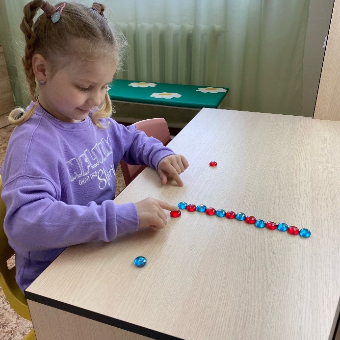 «Цветная дорожка» - педагог выкладывает перед ребенком по вертикали цветные камешки и говорит продолжи ряд, при этом камни красные у левой руки, а синие у правой, ребенку необходимо передвигать камень той рукой, у которой он лежит. Далее усложняем двигательную программу: разбираем ряд наперекрест (красные правой, синие левой).