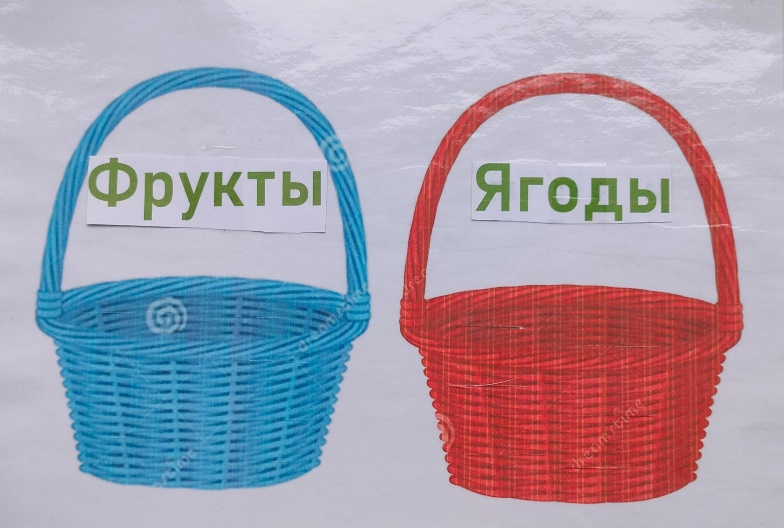 Инструкция: Учитель раздаёт каждому 2 корзиночки с набором фруктов и ягод. Ребенок должен распределить на 2 группы. Индивидуально работа с карточками.