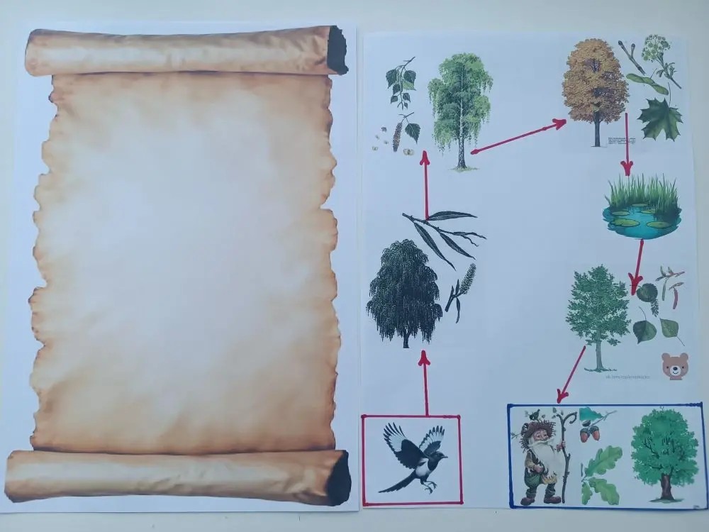 «Дорогие ребята! Пишет вам Лесовичок.Помогите! В нашем лесу произошла страшная беда. Злая колдунья похитила волшебные листья и раскидала их по лесу. И я теперь не могу вернуться домой. А чтобы найти листья, нужно проследовать по плану, выполнить все задания и собрать листья с деревьев, чтобы сложить волшебные пазлы. Тогда я вернусь к себе домой. За выполнение каждого задания получите лист с дерева. Только собрав все листья, можно сложить волшебные пазлы и отправить меня домой».