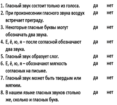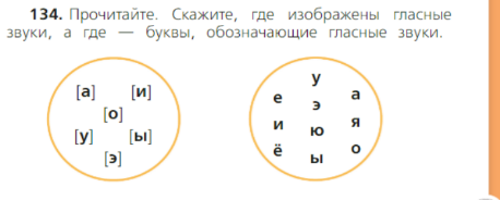 Где изображены гласные звуки? - А где изображены буквы, обозначающие гласные звуки? -Почему вы решили, что звуки именно в первом круге? -Совершенно верно, чтобы различать на письме буквы и звуки, звуки записывают в квадратных скобках. Сейчас возьмите простой карандаш. Соотнесите звук с буквой, которая этот звук обозначает, и проведите между ними линию. Например, звук А обозначается буквой А. Всем понятно, что нужно делать? Вывод: Те буквы состоят из двух звуков Проверьте по образцу. Теперь соотнесите остальные буквы со звуками. Сделайте вывод. Физминутка: Игра “ Камень-вата” Рассмотрите картинки, запишите слова с буквами е.ё.ю.я Работа в парах??? Какую работу выполняют буквы? Подчеркните буквы. обозначающие 2 звука . Подчеркните грамматическую основу. | Ребята работают с картинками , выделяют первый звук Дети объясняют задание и выполняют самостоятельно. Дети проверяют выполненное задание по образцу . Оценивают себя в рабочих листах . Ответы детей Ответы детей.(гласный состоит из голоса,не встречает преград,образует слог) Дети читают в рабочих листах задание. Узнать где звуки, где буквы. Ответы детей (обозначают два звука в начале слова, после гласной,после ь и ъ знаков) Таблица вывешивается на доске. | Дети объясняют задание Дети проверяют выполненное задание по образцу Оценивают себя в рабочих листах Дети ОВЗ прикрепляют признаки гласных звуков на доску. Работают по заданию учителя в рабочем листе. Работают по заданию учителя в рабочем листе. | Приступаем к реализации плана. Возьмите рабочие листы и найдите задание 1. Прочитайте, что нужно сделать: Назвать картинку, выделить первый звук и записать соответствующую букву в тетради, через запятую: